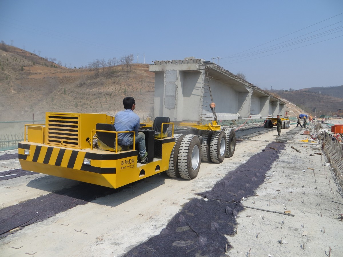 主要適用于預(yù)制梁場(chǎng)與架橋工地較遠(yuǎn),不適合鋪軌或鋪軌費(fèi)用較高的場(chǎng)合。運(yùn)梁車的剎車系統(tǒng)對(duì)縱坡有較大的適應(yīng)性。輪胎與地面摩擦阻力比軌道式運(yùn)梁車有顯著的優(yōu)勢(shì)。